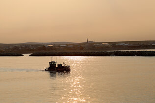 Die Zurückgeblieben genießen an Deck die späte Sonne und beobachten die Kutter der Krabbenfischer von Nome beim Auslaufen.