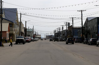 Schon gegen 20.00 Uhr läuft die Bremen im Hafen von Nome ein. Aufgrund der Jahreszeit ist es auf 63 Grad nördlicher Breite fast bis Mitternacht hell. Und daher brechen nach der Freigabe des Schiffes gegen 22.00 Uhr auch nach dem Abendessen noch einige Passagiere zu einem Spaziergang in hellem Sonnenlicht durch die kleine Stadt mit ihrem heruntergekommen Frontier-Charme auf.
