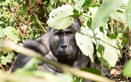 Jetzt ist der Moment da. So lange habe ich darauf gewartet. Hinter mir höre ich schnelles, tiefes Atmen, dazwischen ein leises "Wooooow" – meine Mitreisenden sind genauso aufgeregt wie ich. Nun ist unser Traum wahr geworden. Vor uns sitzt ein zwei Meter großes Gorilla-Männchen im Gebüsch und frisst. Das Tier macht einen friedlichen Eindruck.