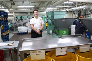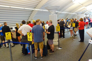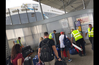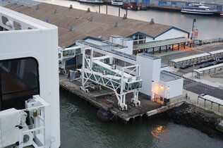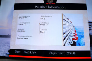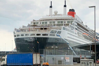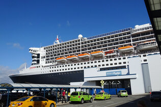 Um 13:10 Uhr Western European Time bin ich in Southampton am Pier, am Ocean Transfer Terminal. Und da liegt auch schon die Queen Mary 2. Überwältigend, wie ein überdimensioniertes Hochhaus. Wikipedia am Smartphone sagt: 345 Meter lang, 72 Meter hoch (ein 380er-Airbus ist gerade einmal 80 Meter lang und 24 Meter hoch). Ich hieve die Koffer aufs Förderband (die Badges mit meiner Kabinennummer habe ich ja schon erhalten), betrete mit dem Handgepäck das Terminal – und warte erst einmal.