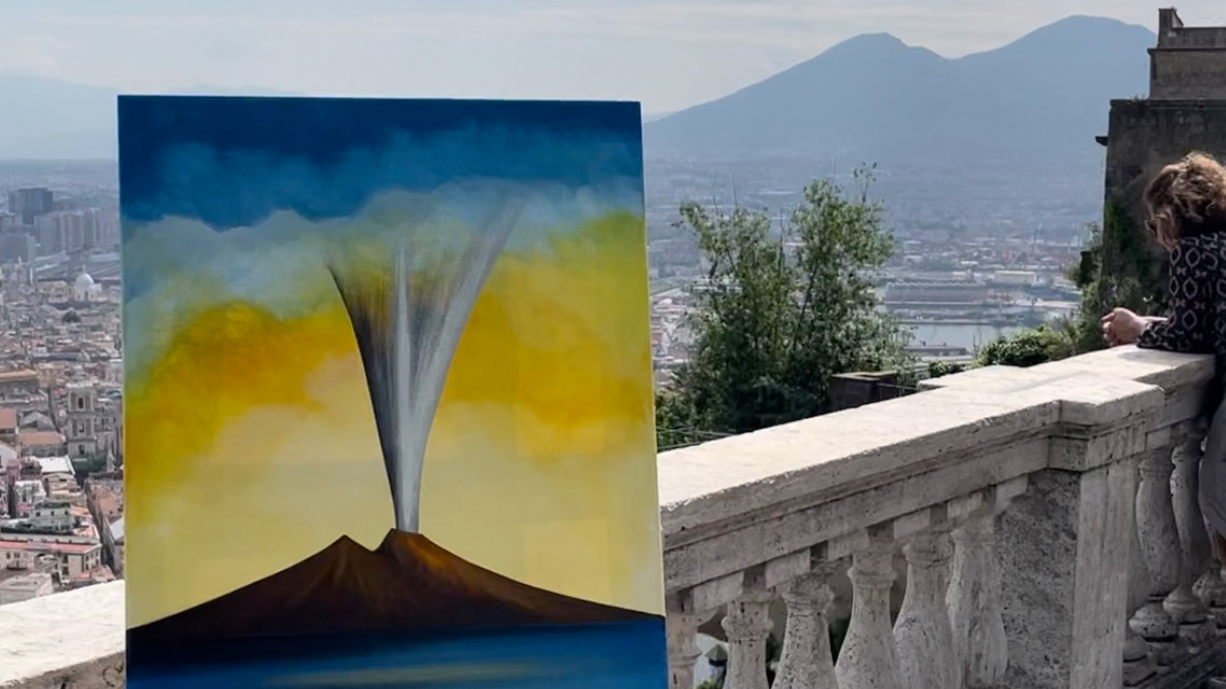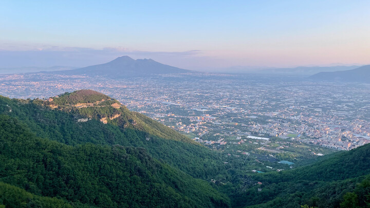 Am Belvedere San Martino blicke ich über Neapel, ein Italiener singt schmalzige Canzones. Zwischen den Häusern flattern blau-weiße Girlanden und bunte Wäsche. Zehn Kilometer vom Stadtzentrum erhebt sich der Vesuv mit seinem markanten Gesicht. Die weggesprengte Spitze des weitläufigen Vulkans hat nach dem katastrophalen Ausbruch kurz nach Christi Geburt, bei dem die antiken Städte Pompeji, Herculaneum, Stabiae und Oplonis verschüttet wurden, eine tiefe Caldera in V-Form hinterlassen.