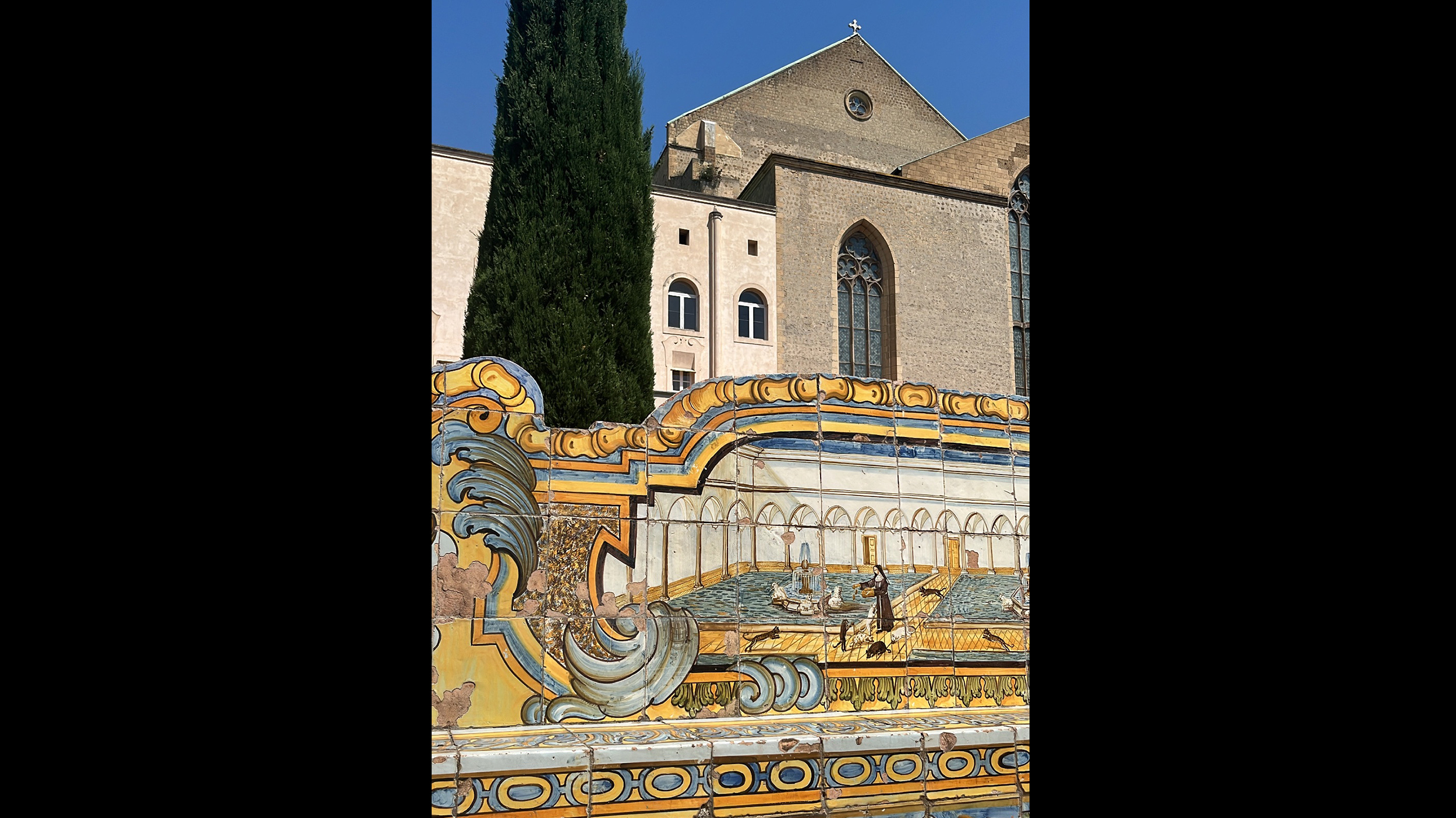 Neapel ist die "Stadt der 500 Kuppeln", die Stadt mit den meisten Kirchen Europas. Soll man eine auswählen, dann empfehle ich die schöne Basilica Santa Chiara und das zugehörige Kloster Maiolicato. Es gilt als eines der schönsten in Kampanien mit einem barocken Kreuzgang und dem Garten mit bunten Säulen und Bänken, die naive Darstellungen aus dem Leben der Bibel und der Mythologie zeigen.