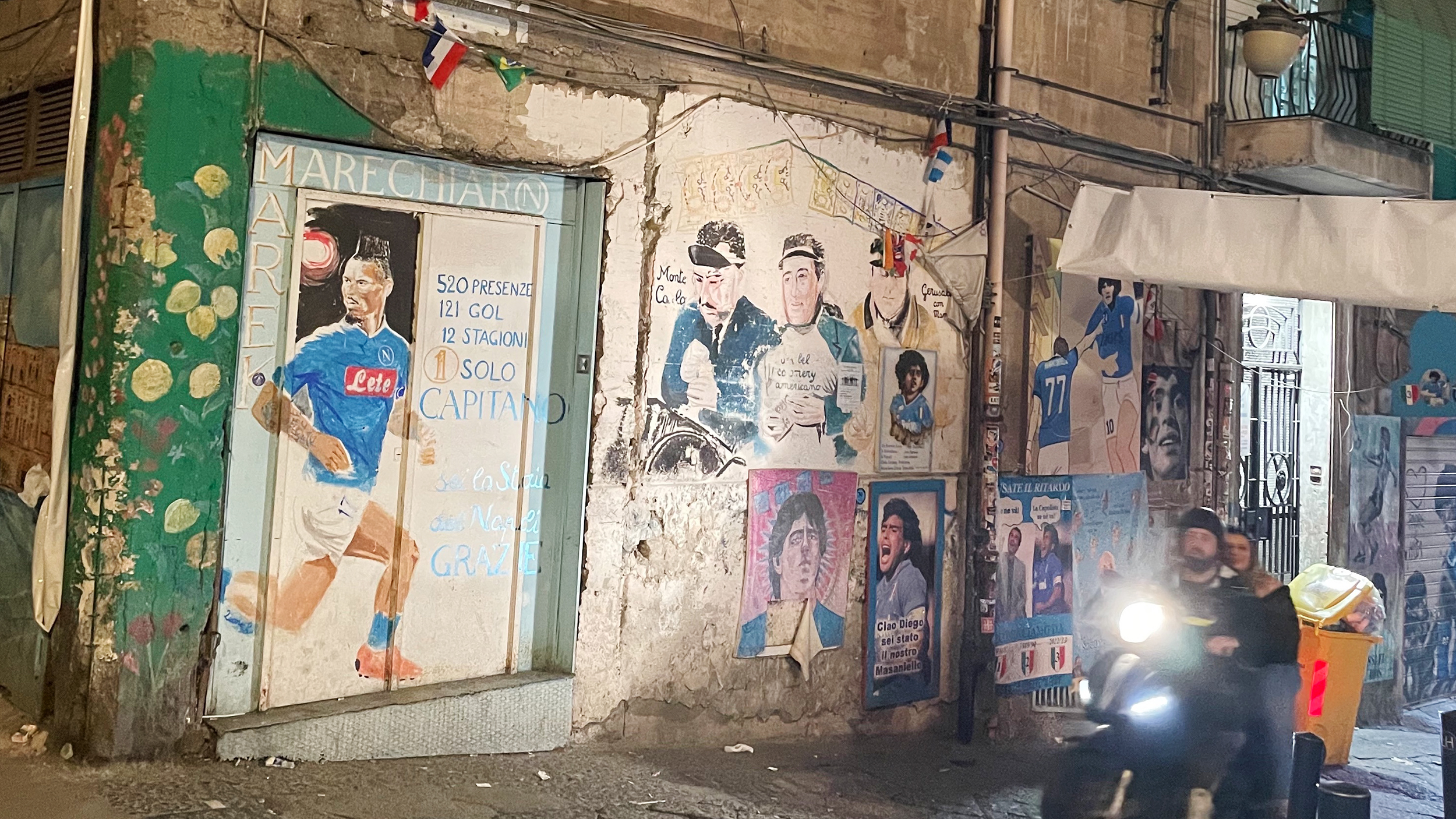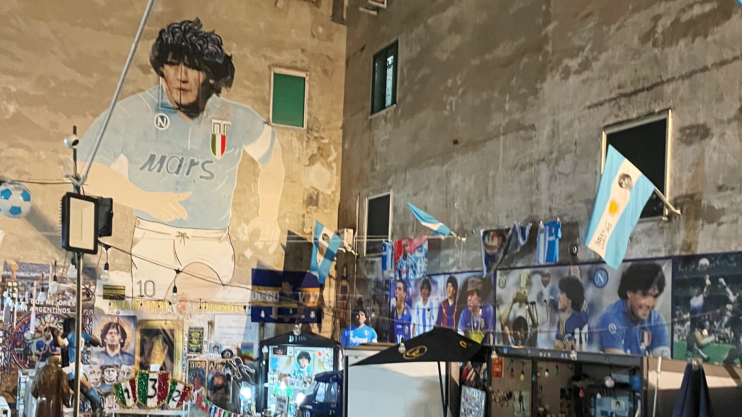 Fußball ist in Italien alles. Ein paar Stufen höher öffnet sich ein Platz zum überdimensionalen Schrein voll Bilder, Fahnen, Andenken und Wandmalereien. Gewidmet ist der größte Andachtsraum der Stadt dem argentinischen Fußballhelden Diego Armado Maradona. Maradona hat Napoli zweimal zum Scudetto geführt und wird wie ein Gott verehrt: "Il D10S", der Gott mit der Nummer 10 am T-Shirt. Hier können auch Menschen Götter sein – selbst, wenn sie mit Mafiabossen koksen.