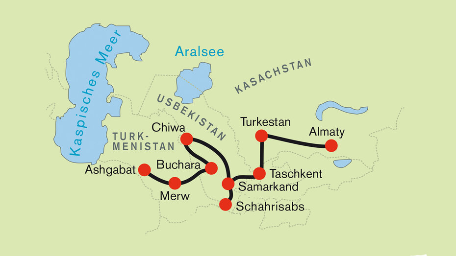 Wir haben es einfacher und bequemer, denke ich und bestelle beim freundlichen Ober noch Kaffee und russischen Wodka. Ich benötige Zeit und Muße, um meine Gehirnwindungen zu sortieren. Denn es ist schon so: Während einer gut zwei Wochen dauernden Tour durch völlig unbekannte Ländereien wie auf dieser Sonderzug-Fahrt mit dem "Registan-Express" durch Turkmenistan, Usbekistan und Kasachstan kann die Vielzahl der Eindrücke dem Reisenden ganz schön zu schaffen machen.