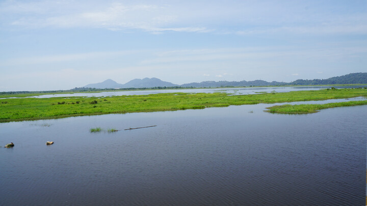 Der Zug passiert den Bukit Merah-See. Riesengroß. Ab zum Observation Deck am Ende des Zugs. Heißer Fahrtwind, Kamera-Klicken überall: Die Landschaft ist hier großes Kino – Reisfelder am Rand und Berge am Horizont. Die Schienen führen über einen Damm, minutenlang. Wunderschön.