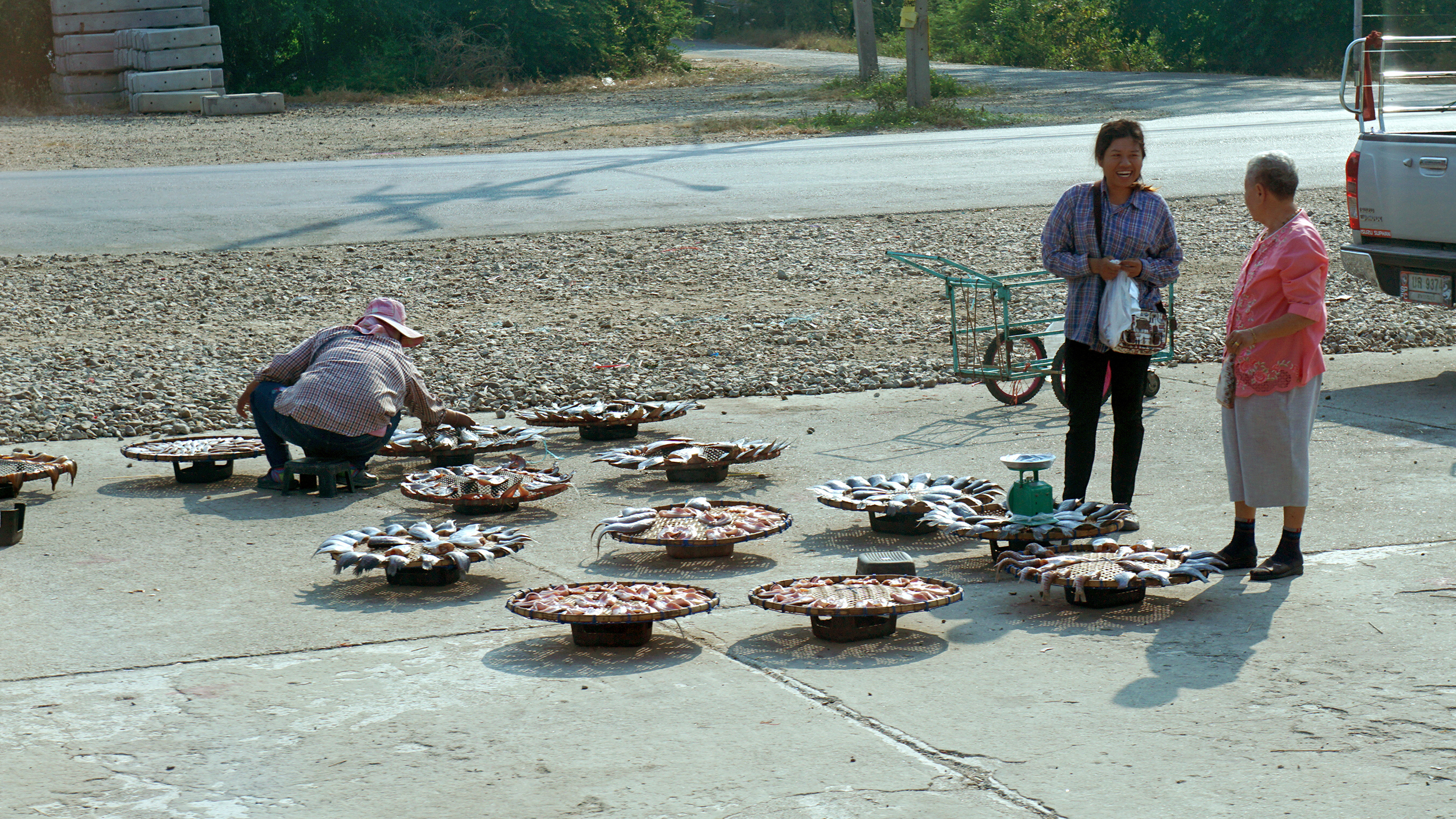 Unser Zug ist die 77 Kilometer des einspurigen Schienenstrangs der Todesstrecke bis zu ihrem Ausgangspunkt bei Nong Pladuk zurückgerumpelt, vorbei an Maisfeldern, Zuckerrohr- und Papayaplantagen. Wasserbüffel stehen regungslos in der brütenden Sonne. An den kleinen Bahnhöfen, die wir passieren, bieten Frauen Fisch- und Currygerichte an.