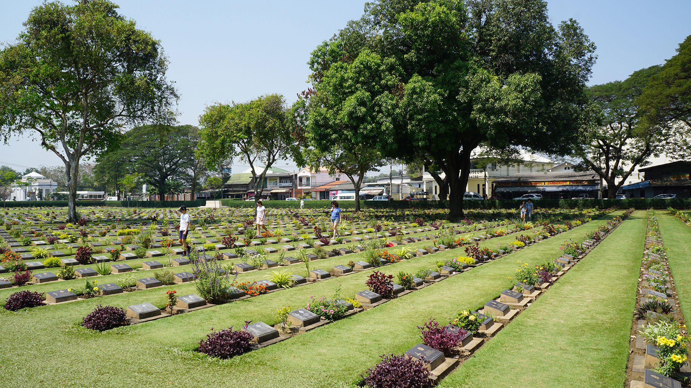 Wir legen an einer bunten Tempelanlage an und schlagen uns zu einem Museum durch, das dem Leid beim Eisenbahn- und Brückenbau gewidmet ist und in dem leider Fotografierverbot herrscht. Gleich gegenüber eine riesige Freifläche: der Friedhof der beim Bau ums Leben gekommenen Gefangenen.