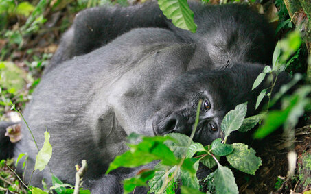 Unter uns, in einer kleinen Senke, hat es sich eine Gruppe der berühmten Berggorillas Ugandas bequem gemacht. Aus den Instruktionen vor der Wanderung wissen wir, dass sie es sich zu dieser Tageszeit nach einem ausgiebigen späten Frühstück bequem gemacht haben. Mit großen Buschmessern schlagen die Guides vorsichtig einige Lücken ins Gestrüpp, damit wir bessere Sicht auf die Gruppe haben. Der riesige schwarze Schatten, den ich zuerst gesehen hatte, entpuppt sich als Silberrücken, der nun ein Schläfchen macht.
