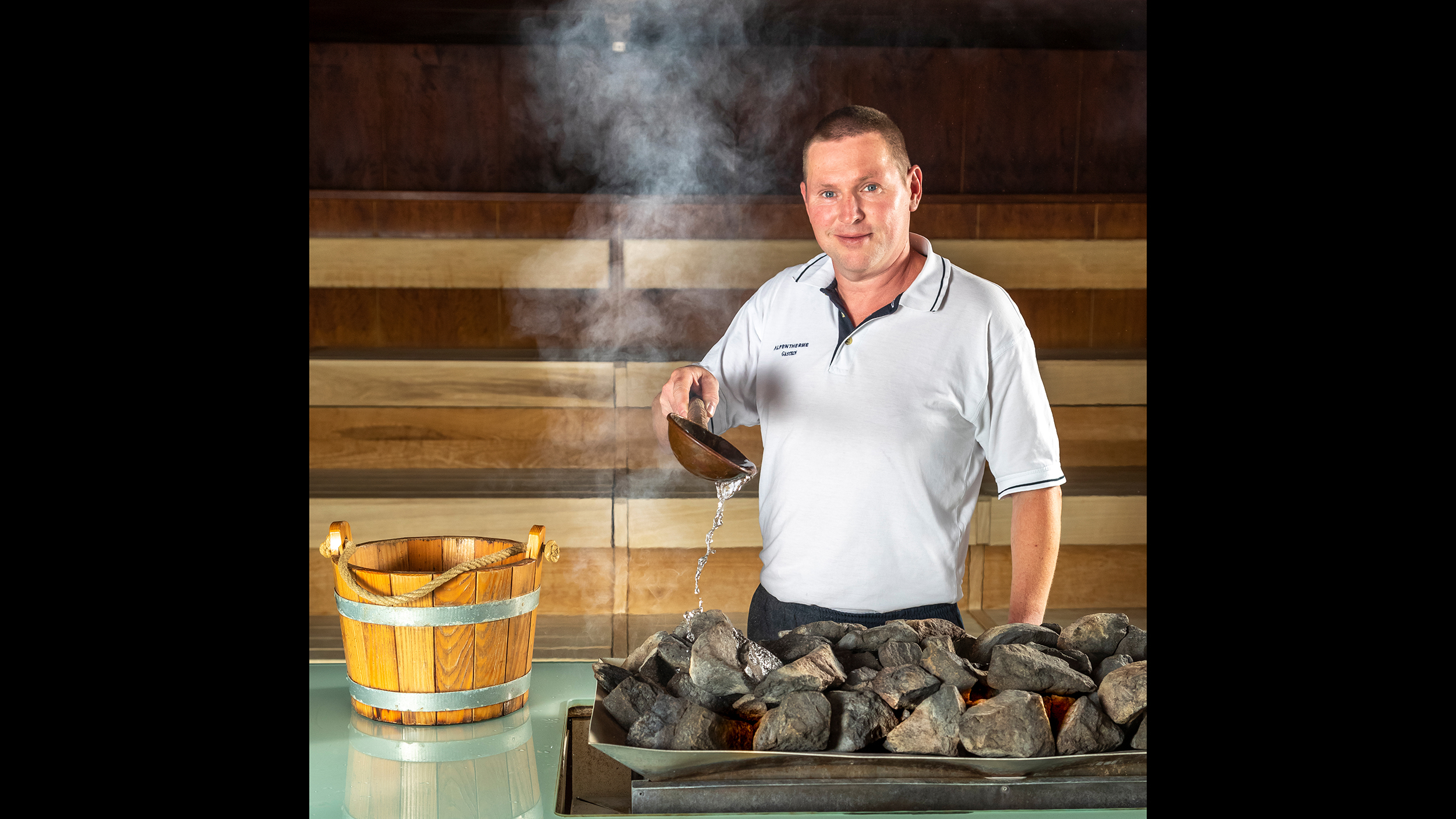 Angefangen hat alles ganz anders. Als gelernter Tischler machte der Sauna-Fan irgendwann sein Hobby zum Beruf. Seit mittlerweile 24 Jahren betreut er die Bade- und Saunagäste der Alpentherme Gastein. Zu seinen Aufgaben gehören die Gästebetreuung und Erste-Hilfe-Leistungen sowie im Saunabereich alles unter Kontrolle zu haben.