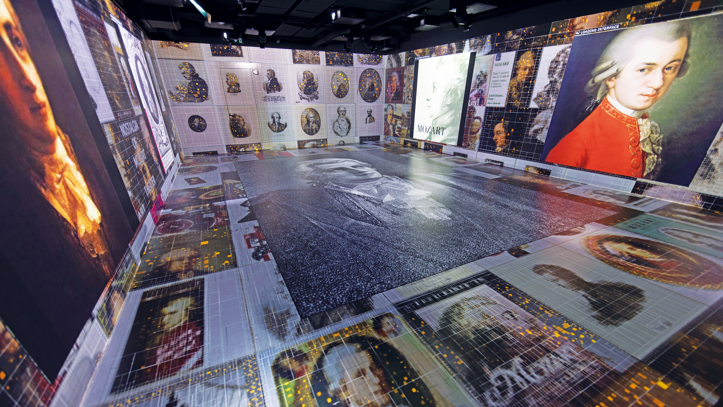 Musikalisch geht es auch beim multimedialen Erlebnis "Mythos Mozart" in der Kärntner Straße 19 in Wien zu. Dort werden die Besucher:innen auf eine faszinierende Reise durch Mozarts Leben und Schaffen entführt. Schon zu Beginn kann sich jede:r Interessierte in Mozarts Zeit "versetzen": Das eigene Gesicht wird durch künstliche Intelligenz in ein lebendiges Porträt aus Mozarts Ära transformiert und auf einer Wand zum Leben erweckt.