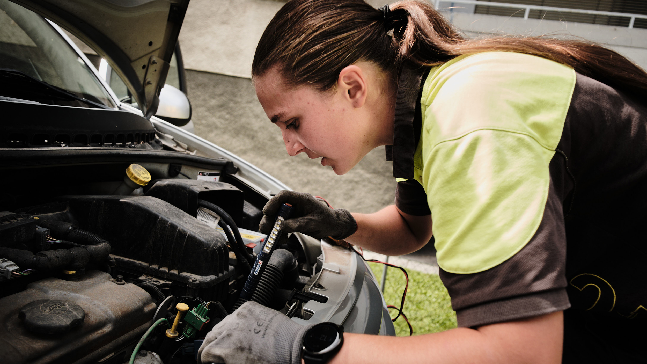Wir dürfen mit Leonie mitfahren und werden Zeugen, wie sie den defekten Kleinwagen im Stadtgebiet von Graz innerhalb von zehn Minuten wieder flottmacht. Leonie erklärt danach lapidar: "Nix Schlimmes, der Starter hat gesponnen."