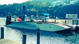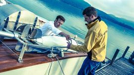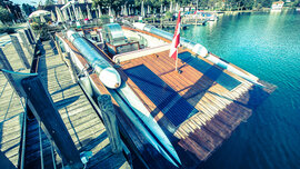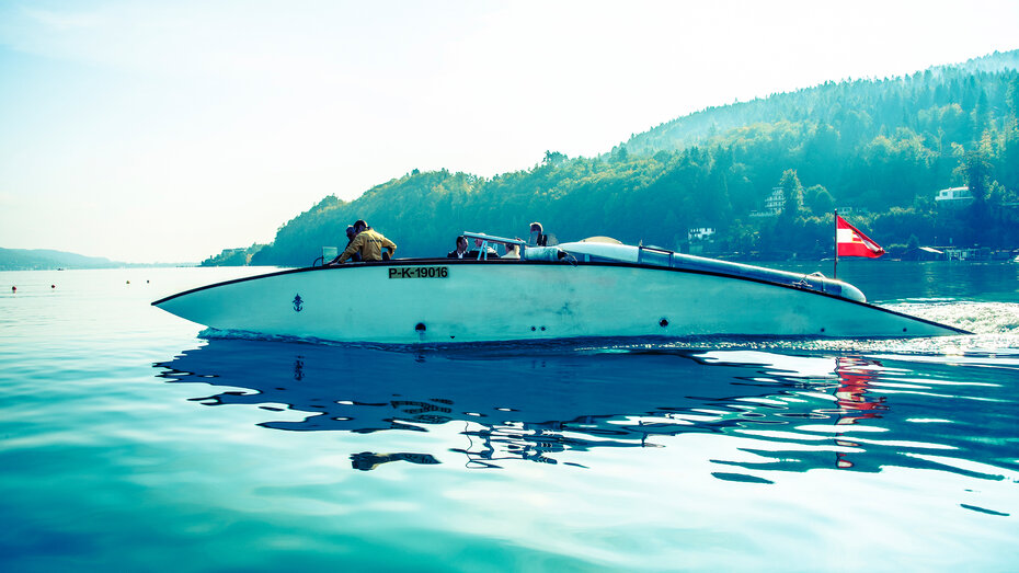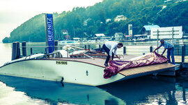 Beinahe beiläufig und ziemlich unscheinbar schmiegt es sich an die linke Flanke des langen Holzstegs, der vom Reifnitzer Ufer nordwärts in den Wörthersee hineinragt. Eine monarch-rote Plane spannt sich hauteng über das Deck aus natürlich und langsam gewachsenem Teak, verhüllt und entblößt gleichermaßen. Wer zu diesem Zeitpunkt noch nicht weiß, was hier vor Anker liegt, wird zweifelsfrei einen aufregend gestalteten Schwimmkörper vermuten – aber ist’s ein Bade-Ponton, ein Boot, ein Bassin?