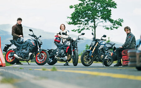 Das geringe Gewicht ist auch ein Grund dafür, dass das Handling der Maschine so erfreulich leichtfüßig ist. Wir gehen sogar noch einen Schritt weiter und behaupten: Das Handling der MT-07 ist beinahe perfekt. Sie lässt sich dank des breiten, gut zur Hand liegenden Lenkers wunderbar einfach manövrieren, ist gutmütig genug, um kleine Fahrfehler zu kaschieren, aber ausreichend direkt, um sich bei forscher Fahrweise keine Blöße geben zu müssen. Draufsetzen, losfahren, wohlfühlen. Es gibt nur eine Handvoll Motorräder am Markt, die so unkompliziert und wirklich fein zu fahren sind wie die MT-07. Und bei denen darüber hinaus auch das Preis-Leistungs-Verhältnis so attraktiv ist.
