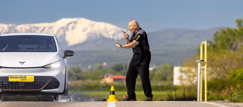 Im Laufe des Tages befördert Timo mich und die anderen Teilnehmer:innen in die unterschiedlichsten Situationen. Zunächst geht es jedoch darum, uns das richtige Bremsen näher zu bringen. Auf gerader Strecke zeigt uns Timo, dass Bremsen auf feuchtem und nassen Untergrund etwas ganz anderes ist als Bremsen auf trockener Fahrbahn. Während mein Auto auf dem Trockenen noch recht zügig zum Stehen kommt, scheint es auf nasser, glatter Fahrbahn schier endlos dahin zu gleiten. Unweigerlich bekomme ich einen Ohrwurm der Red Hot Chili Peppers: "How long, how long will I slide?".