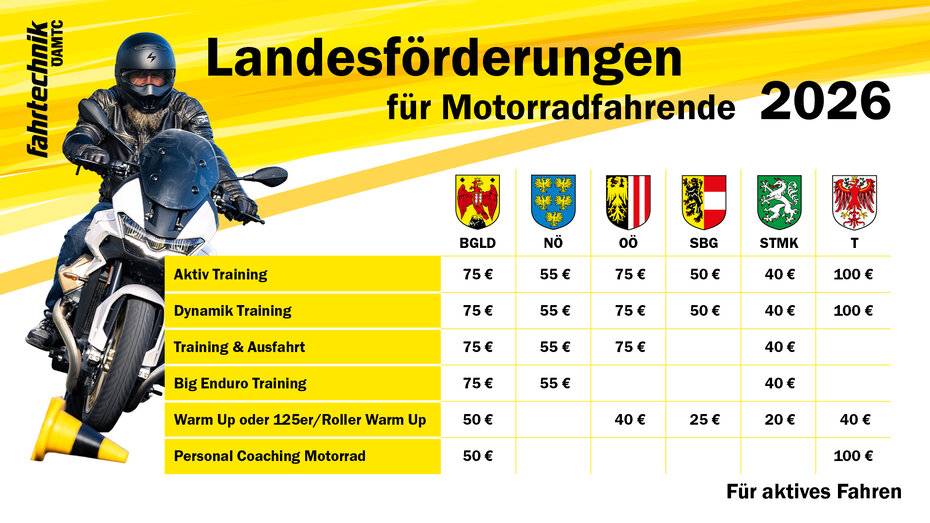 Das Land Salzburg fördert mit der Aktion „Sicher ankommen“ das ganztägige Aktiv Training Motorrad und das ganztägige Dynamik Training Motorrad in der Höhe von EUR 50,- das halbtägige Motorrad Warm Up mit EUR 25,-. Schnell sein, gefördert werden die ersten 100 Teilnehmer und Teilnehmerinnen für je das ganztägige und das halbtägige Training in ganz Salzburg!