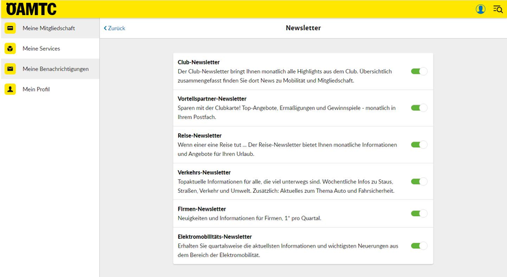 Im Bereich "Mein ÖAMTC" sehen Sie im Abschnitt "Meine Benachrichtigungen" Ihre aktuellen Newsletter-Abonnements und können diese verwalten.