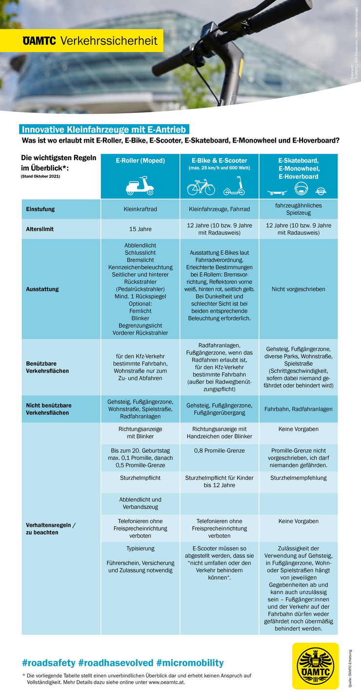 Der ÖAMTC hat im August 2021 die Bekanntheit und Nutzung sowie die Einstellung zu modernen innovativen Klein-Fahrzeugen mit E-Antrieb erhoben - konkret E-Roller (Moped), E-Bike, E-Scooter (Tretroller), E-Monowheel, E-Hoverboard und E-Skateboard (Online-Befragung, N=1.003 repräsentativ für die österreichische Bevölkerung, von Spectra Marktforschung).