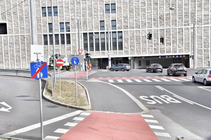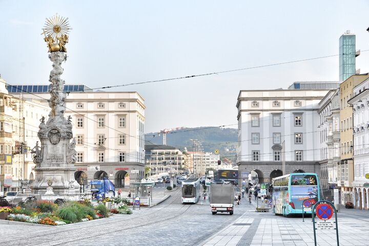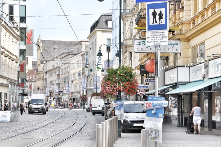 Wir steigen auf und folgen wieder dem Radweg Richtung Hauptplatz Linz. Kurz vor einem Baumarkt wird uns angezeigt, dass der Radweg links weitergehen soll. Oder auch nicht. Wir finden uns auf einem Gehweg wieder. Oder ist er doch für Radfahrer gedacht? Wir begeben uns wohl richtigerweise auf die Fahrbahn, umfahren den Baumarkt und wechseln dann die Straßenseite. Dort geht es weiter auf einem eigenen und abgetrennten Radweg. Dieser führt uns bis in die Wiener Straße. Der folgen wir weiter. Aber nun ist es nicht mehr so sicher für Radfahrer. Die Straße führt vorbei an parkenden Fahrzeugen und es ist relativ eng.Teilweise ist ein Mehrzweckstreifen für Radfahrer vorhanden, jedoch leider nicht durchgängig. Zudem etwas ungewöhnlich:Vor der Unterführung der Westbahn in Richtung Musiktheater befindet sich in der Mitte der Fahrbahn eine Abbiegespur für Radfahrer. Wir wechseln somit die Fahrbahn. Am Musiktheater vorbei geht’s auf der Landstraße Richtung Hauptplatz. Für Radfahrer kein ideales Pflaster.