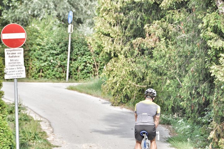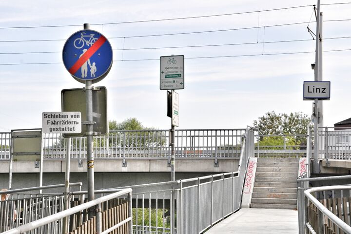 Als Start wählten wir das Volkshaus Ebelsberg. Der Routenplaner berechnet die für uns optimale Radroute. Wir starten und folgen ein paar Meter der Kremsmünsterer Straße, dann biegen wir in die Marktmühlgasse ein. Weiter geht es am Traun-Radweg Richtung Hauptplatz Ebelsberg. Vor einer Rampe zeigt ein Schild an, dass hier der Geh- und Radweg endet und wir die Räder schieben müssen. Am offensichtlichen Radweg fehlt uns jedoch etwas: Nämlich der Hinweis, dass der Geh- und Radweg hier wieder beginnt.