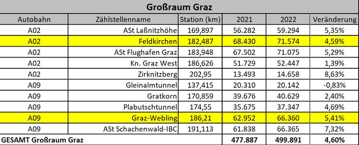 - Die Aussage „Während im Ballungsraum Graz, Linz, Salzburg und Innsbruck an Werktagen der Autoverkehr auf Autobahnen im Vorjahr um vier bis fünf Prozent zugenommen hat, kam es bei Wiener Autobahnen im Jahr 2022 im Vergleich zum Jahr 2021 zum Teil zu einem Rückgang.“ ist verzerrend und entspricht nicht den vorliegenden objektiven Daten. Summiert man alle in Betrieb befindlichen Zählstellen der drei größten Landeshauptstädte, so liegen alle Gesamtentwicklungen im nahezu identen Bereich (Linz: +3,59%; Wien: +3,68%; Graz: +4,60%).