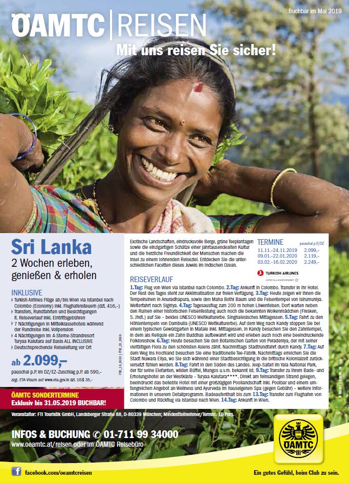 In der Ausgabe Mai 2019 des auto touring Magazins liegt in den Bundesländern Wien, Niederösterreich und Burgenland wie gewohnt ein Folder des ÖAMTC Reisebüros bei. In diesem wird auf Seite 1 ein Reiseangebot für Sri Lanka präsentiert.