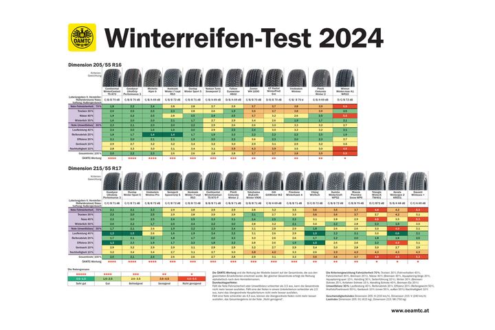 Für den Winterreifentest 2024 haben der ÖAMTC und seine Partnerorganisationen 28 Modelle in zwei Dimensionen untersucht. Die Ergebnisse decken nahezu die gesamte Bandbreite ab, wie Steffan Kerbl, Reifenexperte beim Mobilitätsclub, erklärt: "Die Bestnote 'sehr gut' haben wir nicht vergeben - und auch ein 'gut' schafften nur sechs der 28 Produkte. Am unteren Ende der Tabelle finden sich hingegen sieben 'genügend' und leider auch vier 'nicht genügend'. Der Rest, also elf Modelle, ist 'befriedigend'." Getestet wurde in zwei Hauptkriterien: Einerseits wurde die Fahrsicherheit auf trockener, nasser und winterlicher Fahrbahn (70 Prozent der Gesamtwertung) beurteilt, andererseits wurden alle Testkandidaten in Hinblick auf ihre Umweltbilanz überprüft (30 Prozent).