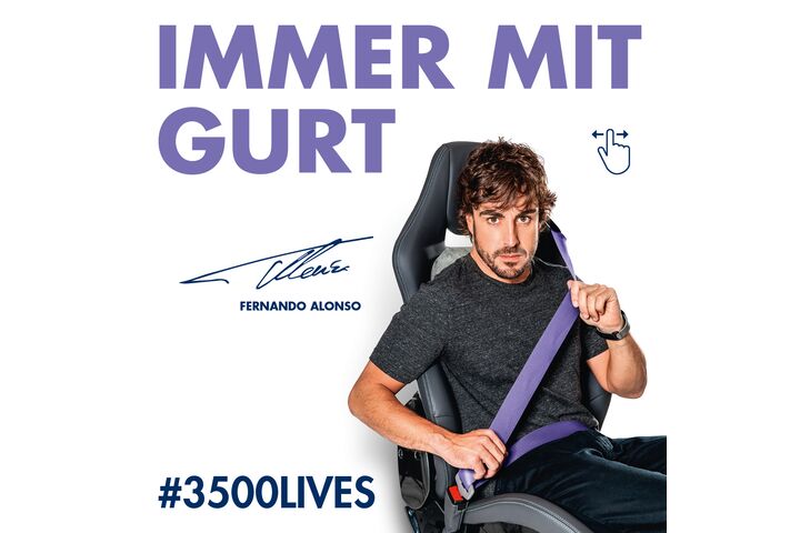 Das #3500LIVES-Sujet "Immer mit Gurt" zeigt Fernando Alonso als Botschafter der Kampagne. Der Motorsportler nutzt seine Vorbildfunktion, um Menschen für die Thematik zu sensibilisieren. Der ÖAMTC trägt die Verkehrssicherheitsinitiativen der FIA auf nationaler Ebene mit. In Kooperation mit MEGABAORD wird das Sujet in den kommenden Wochen in Österreich zu sehen sein – für eine erhöhte Sichtbarkeit auch entlang der Autobahnen.