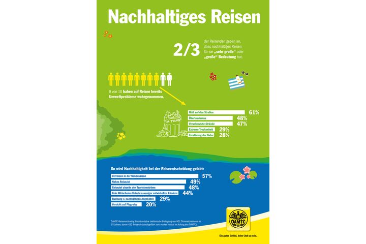 "Rund 80 Prozent der befragten Reisenden haben bereits Umweltprobleme am Urlaubsort wahrgenommen – in Form von Müll auf den Straßen, Übertourismus oder zerstörter Natur", sagt ÖAMTC-Expertin Riedl. Insbesondere in fernen Destinationen wird das häufiger beobachtet. Umweltbewusstes Reiseverhalten legen die Österreicher eher indirekt an den Tag, z.B. indem sie in der Nebensaison verreisen oder ein Reiseziel abseits der Touristenströme wählen. Immerhin jeder Fünfte gab an, im Sinne der Nachhaltigkeit bewusst auf Flugreisen zu verzichten.