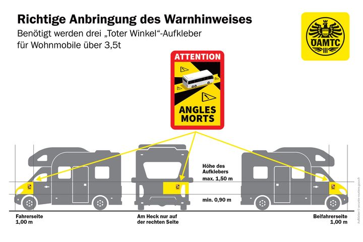 Radfahrer oder Fußgänger werden häufig übersehen, weil sie sich im toten Winkel schwerer und großer Fahrzeuge bewegen. Frankreich schreibt daher seit Jahresanfang an Fahrzeugen über 3,5 Tonnen Warnhinweise mit der Aufschrift "Attention! Angles Morts" (französisch für "Achtung! Toter Winkel") vor. "Auch nicht in Frankreich zugelassene Wohnmobile fallen unter die Vorschrift", sagt Tomas Mehlmauer, Präsident des Österreichischen Camping Clubs (ÖCC). Daher sind auch österreichische Frankreich-Urlauber betroffen.