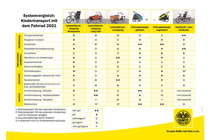 ÖAMTC-Techniker Steffan Kerbl fasst zusammen: "Das eine, herausragende System, das in allen Anwendungsfällen vollkommen überzeugen kann, gibt es nicht. Entsprechend wichtig ist es, dass man sich bereits vor einem Kauf gut überlegt, wofür und wie oft man es nutzen will." Beispielsweise macht es einen großen Unterschied, ob man neben Kindern auch ab und an seinen Einkauf transportieren will, ob das Rad mit in den Urlaub soll – oder wie viel man überhaupt dafür ausgeben möchte (die Spanne reicht auch ohne E-Antrieb von 250 bis 2.200 Euro). Untersucht wurden Handhabung, Fahrverhalten und Komfort. Und auch die Sicherheit wurde überprüft, unter anderem mit einem Crashtest (Seitenaufprall durch ein 30 km/h schnelles Auto). Letzterer Test zeigte vor allem eines: Das Tragen eines Helms wird sowohl für die Eltern als auch für die Kinder dringend empfohlen – das zeigen auch alle Analysen der ÖAMTC-Unfallforschung.