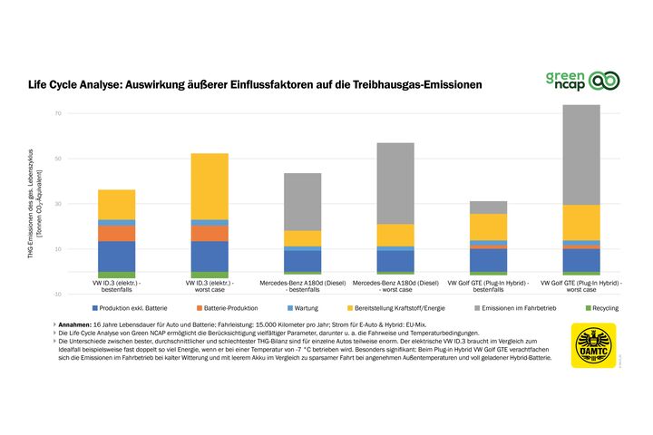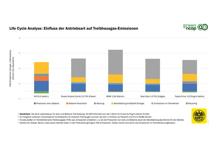 Im Jahr 2019 haben der ÖAMTC und seine Partnerclubs begonnen, im Rahmen des Green NCAP die Umweltfreundlichkeit aktueller Fahrzeuge zu untersuchen. Seither haben über 60 Autos die Messungen auf dem Rollenprüfstand und auf der Straße durchlaufen und wurden hinsichtlich Emission von Treibhausgasen (THG) in CO2-Äquivalent (CO2, N2O, CH4), Schadstoffausstoß und Energieverbrauch des Antriebs bewertet. "Bisher haben wir die Fahrzeuge im Fahrbetrieb untersucht. Das ändert sich ab sofort, denn nun wird jedes Auto, das die Green NCAP-Messungen durchläuft, zusätzlich einer Lebenszyklusanalyse unterzogen", erklärt Max Lang, Fahrzeug- und Umweltexperte beim ÖAMTC. "Das ist ein wichtiger Schritt, um die tatsächlichen THG-Emissionen darzustellen, indem beispielsweise auch die Erzeugung der Batterie beim E-Auto und die Bereitstellung von Kraftstoff bzw. Energie berücksichtigt werden."