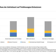* Die Emissionen, die ein Fahrzeug – egal, welcher Antriebsart – bei der Herstellung und im Fahrbetrieb verursacht, hängen stark von der Masse ab. In der Kompaktklasse bedeutet das beispielsweise, dass der rein elektrische VW ID.3 im gesamten Lebenszyklus einen Durchschnittswert von 35 Tonnen CO2-Äquivalent an Treibhausgasen verursacht, nimmt man den Strommix der EU als Basis. Die Plätze dahinter belegen in dieser Klasse der Plug-in Hybrid (Toyota Prius 1.8, ca. 40 Tonnen) sowie der mit Erdgas betriebene Seat Ibiza 1.0 TGI und der Diesel (Skoda Octavia 2.0 TDI), jeweils mit einem CO2-Äquivalent von ca. 42 Tonnen. Beide liegen aufgrund des geringeren Verbrauchs noch deutlich vor dem Benziner (BMW 118i, ca. 53 Tonnen).