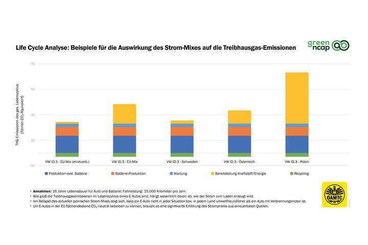 Für den ÖAMTC-Experten ist klar, dass die E-Mobilität ein wichtiger Puzzlestein ist, um die THG-Emissionen des Straßenverkehrs zu reduzieren. "Die Lebenszyklusanalyse bestätigt auch, dass E-Autos sehr umweltfreundlich betrieben werden können. Das ist positiv – man darf aber nicht unter den Tisch kehren, dass ein komplett CO2-neutraler Betrieb unter den aktuellen Voraussetzungen nicht so leicht möglich ist, wie man es sich wünschen würde", stellt Lang klar. "Aus unserer Sicht müssen im Hinblick auf den Fahrbetrieb von E-Autos zwei Dinge passieren: Der Strom muss grüner werden, allerdings nicht nur in Österreich, sondern EU-weit. Und es muss klar sein, dass auch E-Fahrzeuge einen massiven Umweltnachteil haben, je größer sie sind."