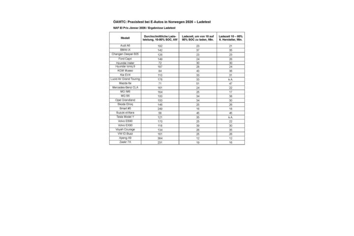 Beim Aufladen erreichten 13 der 24 getesteten Fahrzeuge den gewünschten Ladestand von 80 Prozent in weniger als 30 Minuten. Sechs Fahrzeuge waren sogar schneller auf 80 Prozent als vom Hersteller angegeben. "Bei diesem Ladetest zeigte sich, wie wichtig eine gut temperierte Batterie für das Laden eines Elektrofahrzeuges ist. Trotz Temperaturen von minus zehn Grad Celsius an den Ladestationen haben die getesteten Fahrzeuge gut abgeschnitten", erklärt Merker. Laut der Erfahrung des ÖAMTC werden in Zukunft Ladegeschwindigkeit, Verbrauchseffizienz und Verfügbarkeit von Ladestationen wichtiger sein als die maximale Reichweite eines Elektrofahrzeuges.