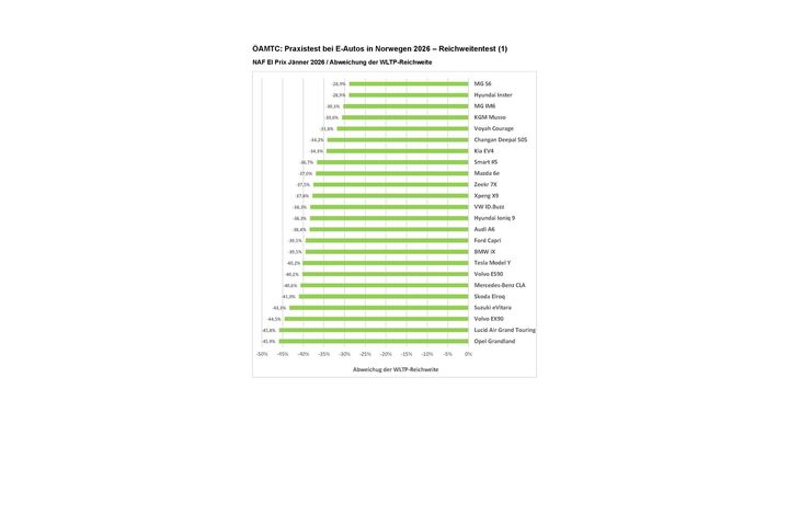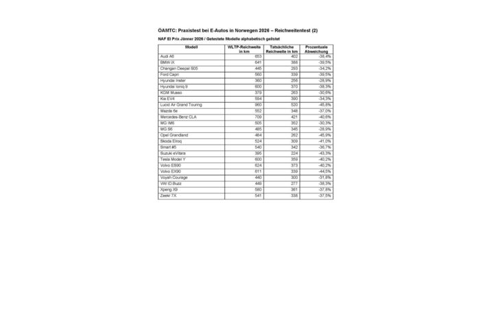 Im Jänner 2026 war der ÖAMTC wieder beim weltweit größten Reichweitentest von Elektrofahrzeugen "El Prix" dabei. Dieser Praxistest wird jährlich zweimal vom norwegischen Partnerclub NAF durchgeführt. "Bei Rekordwerten von bis zu minus 31 Grad Celsius zeigte sich die starke Auswirkung der niedrigen Temperatur auf die Reichweite von E-Autos: Kein Fahrzeug kam in die Nähe der angegebenen WLTP-Werte. Die höchsten Abweichungen zur angegebenen Reichweite lagen bei fast 46 Prozent, etwa bei Opel Grandland und Lucid Air Grand Touring, die niedrigste bei knapp unter 30 Prozent – bei MG S6 und Hyundai Inster. Im Durchschnitt lag die Abweichung bei knapp 38 Prozent unterhalb der WLTP-Reichweite", fasst ÖAMTC-Techniker Florian Merker zusammen.
