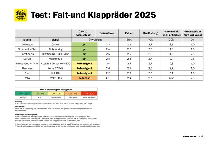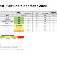 Der ÖAMTC und seine Partnerorganisationen haben acht Modelle ohne Elektromotor untersucht: Vier wurden mit "gut", drei mit "befriedigend" und eines mit "genügend" beurteilt. "Wir haben alle Räder einem Fahrtest unterzogen, ihre Handhabung überprüft und uns angesehen, wie es um die Sicherheit und Haltbarkeit bestellt ist. Denn auch, wenn ein Klapprad in Hinblick auf den Transport noch so praktisch ist, darf es speziell bei der Sicherheit keine Abstriche geben", stellt Darnhofer klar. Eine Schadstoffprüfung wurde ebenfalls durchgeführt, Beanstandungen gab es in dieser Kategorie keine.