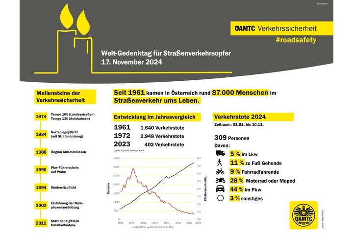 Auf Österreichs Straßen haben seit Beginn der Aufzeichnungen im Jahr 1961 insgesamt fast 87.000 Menschen ihr Leben verloren. "Trauriger Höhepunkt war das Jahr 1972 mit 2.948 Verkehrstoten. Von derartigen Zahlen sind wir heute trotz deutlich höheren Kfz-Bestands und mehr Mobilität zum Glück weit entfernt: 2024 starben laut Zahlen des Innenministeriums bisher 309 Menschen im Straßenverkehr", fasst ÖAMTC-Verkehrstechniker David Nosé zusammen. “Die wenigsten Verkehrstoten, nämlich 344, wurden laut Statistik Austria im Jahr 2020 verzeichnet - einem Jahr, in dem die Mobilität pandemiebedingt teils stark eingeschränkt war.”