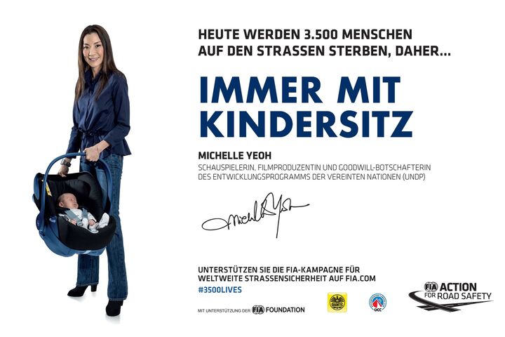 Bei Unfällen kommen Kinder im Pkw meist zu Schaden, weil sie gar nicht oder falsch gesichert werden. Dabei bewahrt ein geeignetes Kinderrückhaltesystem den Nachwuchs schon bei leichten Unfällen vor schweren Verletzungen, denn im Falle eines plötzlichen Bremsmanövers ist das Verletzungsrisiko bereits bei geringen Geschwindigkeiten hoch: "Ein Aufprall mit 50 km/h kommt einem Sturz aus dem dritten Stockwerk gleich. Kinder sollten daher unbedingt entsprechend ihrer Größe und ihres Gewichts korrekt im Auto gesichert werden", erklärt der ÖAMTC-Techniker Steffan Kerbl. Als Kampagnenbotschafterin will Schauspielerin Michelle Yeoh im Zuge der FIA-Kampagne #3500LIVES die Öffentlichkeit für das Thema Kindersicherung sensibilisieren.