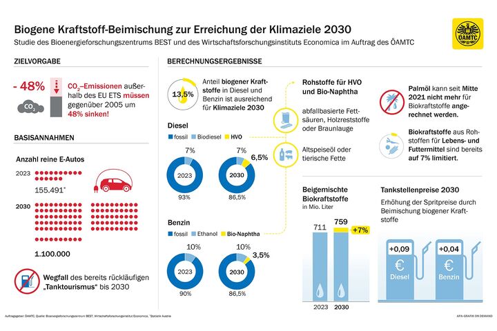 Eine in der verfügbaren Zeit umsetzbare, realistische Lösung für diese Herausforderung zeigt eine vom ÖAMTC in Auftrag gegebene Studie auf, die vom Bioenergieforschungszentrum BEST und vom Wirtschaftsforschungsinstitut Economica erstellt wurde: Neben einer weiteren Stärkung der E-Mobilität ist eine Erhöhung des biogenen Anteils im Kraftstoff der Schlüssel zur Erreichung der Klimaziele bei gleichzeitigem Erhalt leistbarer Mobilität. "Wenn sich die Elektro-Quote weiterhin positiv entwickelt, müssen wir 2030 nur geringfügig mehr an Bio-Kraftstoffen einsetzen, um das Klimaziel zu schaffen – und wir stellen damit auch sicher, dass alle Österreicher:innen weiter mobil bleiben und sich das auch leisten können", fasst Wiesinger zusammen. "Wir fordern daher: Erstens muss eine Erhöhung der Biosprit-Beimengung im NEKP verankert werden. Zweitens braucht es einen rechtlich bindenden Zielpfad in Hinblick auf die schrittweise Erhöhung des Bio-Anteils und Art der beizumengenden Kraftstoffe. Und drittens muss der Bio-Anteil von Mineralölsteuer und CO2-Abgabe befreit werden."