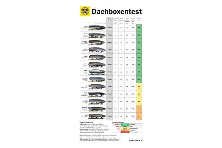Als insgesamt beste Box erwies sich im ÖAMTC-Test das Modell von Audi. "Neben dem guten Ergebnis im Crashtest überzeugten vor allem die Fahreigenschaften bei dynamischen Ausweichmanövern und Bremstests. Insgesamt haben wir, sieht man vom relativ hohen Eigengewicht von knapp 23 Kilogramm sowie der etwas umständlichen Montage ab, kaum Schwächen festgestellt", hält Kerbl fest. Auf Platz 2 folgt die "Motion 3 XL Low" von Thule - was einem Doppelsieg gleichkommt: Auch die von Audi unter eigenem Branding vertriebene Box wird von Thule gebaut. Rang drei geht an Mercedes mit der "Dachbox M", ein ausgewogenes Modell, das - wie die Produkte von Audi und Thule - ebenfalls im hochpreisigen Sektor angesiedelt ist. Deutlich günstiger und im Test nicht viel schwächer sind die Dachboxen von Hapro, Kamei, Atera und Norauto. "In Sachen Sicherheit muss man hier nur geringe Abstriche hinnehmen. Zumeist sind es Verarbeitungs- und Komforteigenschaften, die den Unterschied zu teureren Modellen ausmachen", erklärt Kerbl.