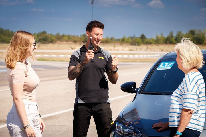 Das Training, das ab 500 bis 1.000 absolvierten Ausbildungskilometern empfohlen wird, findet über insgesamt drei Einheiten zu je 50 Minuten statt und beinhaltet Tipps und Tricks sowohl für die Fahrer:innen als auch für deren Begleitung. Schließlich tragen die Begleitpersonen bei der L17-Ausbildung für alle Fahrzeuginsass:innen die Verantwortung. Um die Führerscheinanwärter:innen und ihre jeweiligen Begleitpersonen entsprechend vorzubereiten, wird das Handling des Fahrzeugs während des Trainings ausgiebig auf die Probe gestellt, etwa in einem Slalom-Parcours, beim Notbremsen und in bewässerten Kurven. Insgesamt gibt es für beide etliche Sicherheitstipps, unter anderem auch wie die Beifahrer:innen das Auto mit der Handbremse zum Stehen bringen oder wie sie von ihrem Platz aus kontrolliert ins Geschehen eingreifen können. Zum Abschluss geht es noch auf die Schleuderplatte, wo den Teilnehmenden eindrucksvoll gezeigt wird, welche enormen Kräfte bei einem schleudernden Fahrzeug wirken.