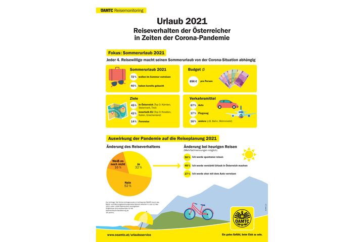 Auch heuer war eine langfristige Urlaubsplanung aufgrund der Coronavirus-Pandemie und der damit verbundenen Reisebeschränkungen kaum möglich. Welche konkreten Urlaubspläne die Österreicher für den Sommer haben und was sie von nun an beim Reisen anders machen, wollte der Mobilitätsclub mit dem heurigen Reisemonitoring herausfinden. Ein zentrales Ergebnis: "Spontanität ist auch heuer nötig: Jeder 4. Reisewillige macht seinen Sommerurlaub von der Corona-Situation abhängig und möchte abwarten, wie sich die Situation entwickelt – das sind zehn Prozent mehr als noch 2020", stellt ÖAMTC-Touristikerin Magdalena Draxler klar. "Zum Befragungszeitraum Anfang/Mitte Mai hatten erst 40 Prozent ihren geplanten Hauptsommerurlaub bereits gebucht. Unter den Familien mit Kindern hatte sich immerhin schon jede zweite festgelegt." Die Mehrheit der Befragten war jedoch auch zuversichtlich, dass ihr Urlaub in der geplanten Form zustande kommen wird – ein Drittel hingegen zeigte sich eher pessimistisch.