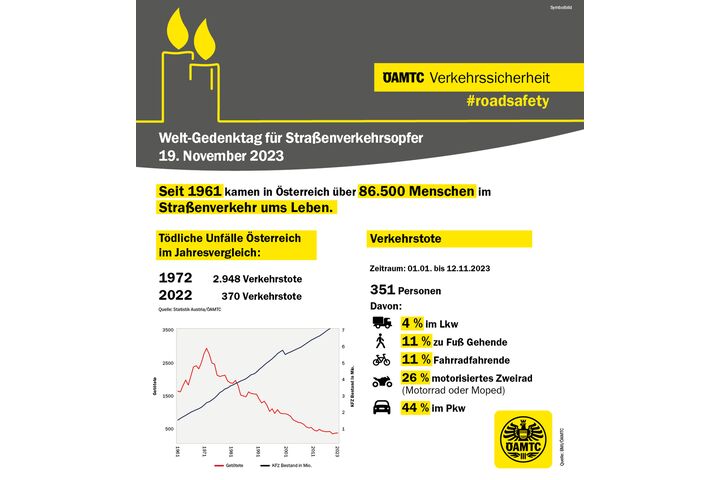 Auf Initiative der Vereinten Nationen wurde daher der jährliche Welt-Gedenktag für Straßenverkehrsopfer eingeführt, der heuer am 19. November stattfindet. Viele Maßnahmen wurden bereits erfolgreich gesetzt. Um die "Vision Zero” – eine Welt ohne Verkehrstote – zu erreichen, gibt es allerdings noch eine Menge zu tun, wie ÖAMTC-Verkehrsexperte David Nosé ausführt: "Maßgebend wird sein, wie rücksichtsvoll und vorausschauend sich Verkehrsteilnehmende im Straßenverkehr bewegen. Vor allem Ablenkung hinter dem Steuer ist – nicht nur in Österreich – eine große Gefahr."