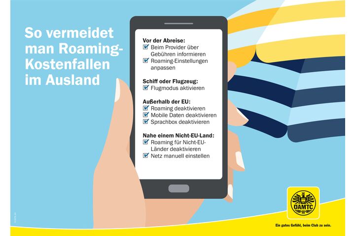 Auf dem Kreuzfahrtschiff oder der Fähre im Internet surfen oder im EU-Ausland Nachrichten auf die Sprachbox empfangen – die Smartphone-Nutzung auf Reisen kann unter Umständen teuer werden. Und das, obwohl im Jahr 2017 die Roaming-Gebühren innerhalb der EU-Mitgliedstaaten, in Island, Liechtenstein und Norwegen abgeschafft wurden. "Aber es gibt Ausnahmen: Fair Use Policy, 'Geisterroaming', Satellitennetzwerke oder Grenzgebiet – diese sollte man kennen, ansonsten kann es sehr schnell teuer werden", warnt ÖAMTC Reiseexpertin Yvette Polasek. "Reisende sollten sich vor der Abfahrt beim Mobilfunkanbieter über die Konditionen ihres Tarifs im jeweiligen Reiseland informieren und die Einstellungen entsprechend anpassen."