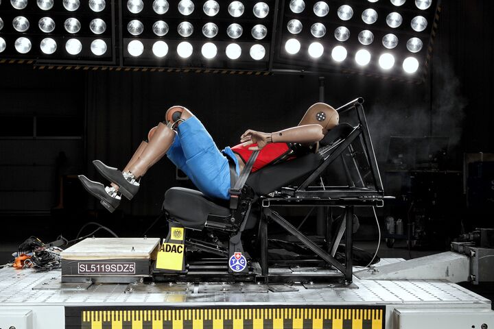 Ebenso verhängnisvoll sind Füße auf dem Armaturenbrett, wie sie bei längeren Fahrten, etwa in den Urlaub, öfters bei Insassen zu sehen sind. Der Crashtest zeigt: Bei einer frontalen Kollision wird der im Armaturenbrett verbaute Frontairbag ausgelöst und drückt die Füße des Dummys nach oben. Aufgrund der zurückgelehnten Sitzposition wird der Oberkörper stärker beschleunigt und prallt mit dem Kopf auf das eigene Knie bzw. Schienbein. Beim Zurückschleudern dreht sich der Dummy aus dem Gurt und trifft die Kopfstütze nicht mehr. "Bei einem realen Unfall würde das zu schwersten bis tödlichen Verletzungen im Kopf, an der Wirbelsäule und/oder in den Beinen führen", weiß der ÖAMTC-Experte und stellt klar: "Auch wenn es bequem erscheinen mag, ist eine derartige Sitzposition bei allen Fahrten zu unterlassen." Hier ist auch an die Lenker zu appellieren, dass sie ihre Mitfahrenden zur Einhaltung einer korrekten Sitzposition ansprechen.