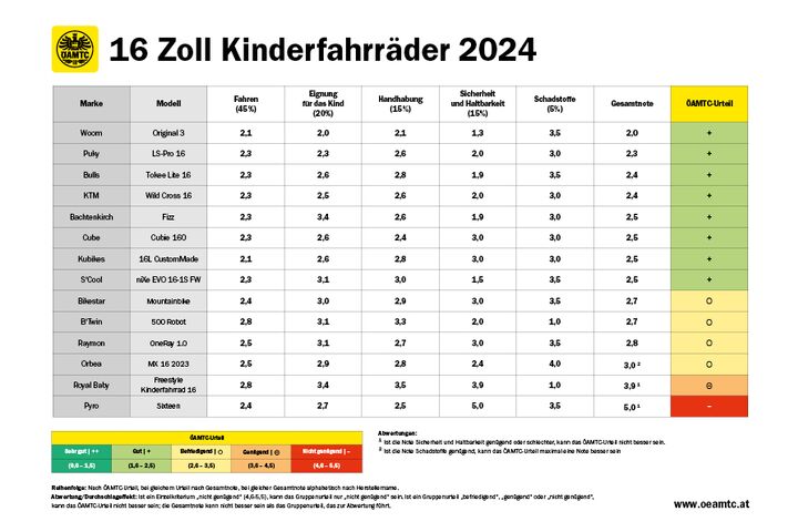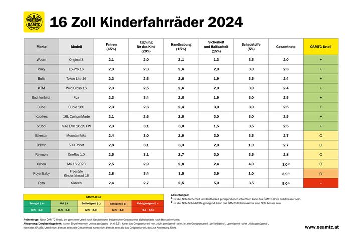 Wichtigstes Kriterium in der Untersuchung war das Fahrverhalten, überprüft wurden aber auch die generelle Eignung für Kinder, Handhabung, Sicherheit und Haltbarkeit sowie der Schadstoffgehalt. Mit den Ergebnissen zeigt sich der ÖAMTC-Experte insgesamt zufrieden: "Es gab zwar kein 'sehr gut', immerhin wurden aber acht der 14 Testkandidaten mit 'gut' beurteilt, vier schafften ein 'befriedigend'." Ein Modell kam nicht über ein "genügend" hinaus, eines fiel aufgrund von Sicherheitsmängeln mit "nicht genügend" durch. Die Ergebnisse im Überblick: www.oeamtc.at/tests.