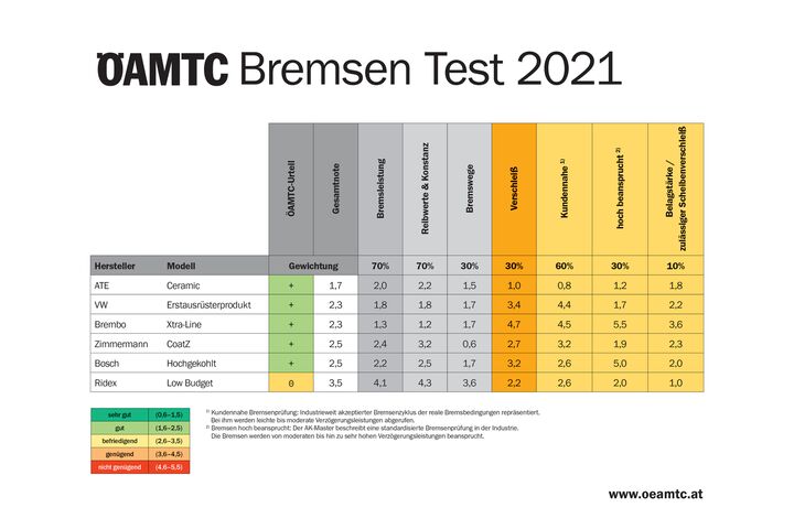 Der günstigste Testkandidat von Ridex mit knapp 100 Euro ist "gut" beim Verschleiß und auch der Bremsweg aus 100 km/h ist nur knapp einen Meter länger als beim VW-Originalersatzteil. Der Reibwert ist jedoch allgemein unterdurchschnittlich und besonders unter Last oder beim Heißbremsen fällt er dramatisch ab, was insgesamt zur Note "befriedigend" führt. Die detaillierten Ergebnisse zu allen Produkten findet man unter www.oeamtc.at/tests.