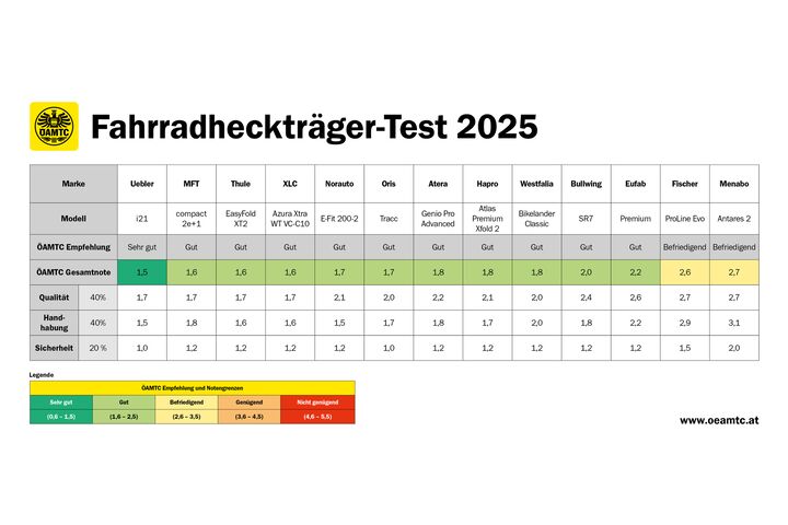 Testsieger ist der Uebler i21, der mit seiner einzigartigen und sehr simpel bedienbaren Montageart heraussticht, gleichzeitig der leichteste Heckträger ist und im verstauten Zustand am wenigsten Platz benötigt. Am anderen Ende des Testfelds steht der Menabo Antares 2, der insgesamt aber auch noch "befriedigend" abschließt. Der aufwändige Erstaufbau und die sperrigere Bedienung verhindern aber eine bessere Bewertung. Ebenfalls nur "befriedigend" schneidet der Fischer ProLineEvo ab – auch hier ist der Erstaufbau aufwändig. Bei der eigentlichen Montage muss eine Klemmkraft von 45 kg aufgebracht werden. Zwischen diesen beiden Modellen und dem Testsieger liegt ein breites Feld von zehn Produkten, die mit "gut" bewertet wurden – Details in der Testtabelle und unter www.oeamtc.at/tests.