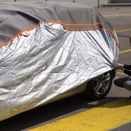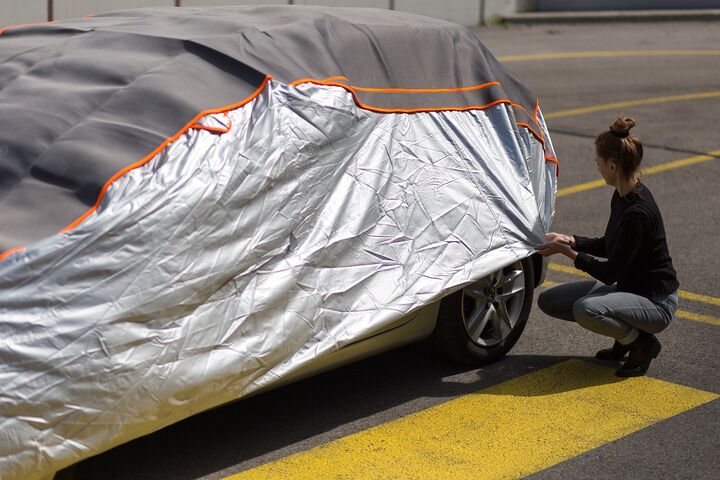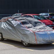 - Eine Decke mitführen. "Wer keinen geeigneten Unterstand hat, kann eine Decke über Autodach, Kofferraum- und Motorraumdeckel legen. So können vier von fünf Hagelschlag-Schäden verhindert werden", erklärt Merker. Damit der Wind die Decke nicht davon weht, kann man sie mit Gummispannern oder Gepäckspinnen fixieren. Falls keine Spannhilfen zur Verfügung stehen, kann man die Decke auch sehr gut in die Autotüren oder die Fensterscheiben einklemmen.