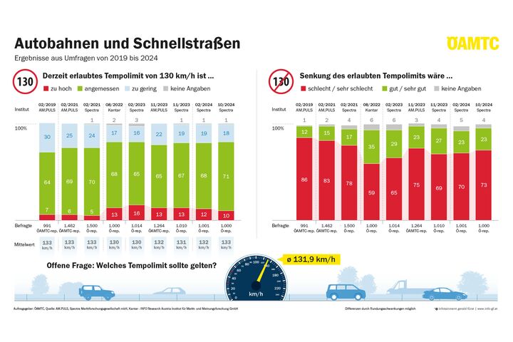 Am Rande der Koalitionsverhandlungen wird aktuell eine Anhebung des Tempolimits auf Autobahnen und Schnellstraßen auf 150 km/h kolportiert. Details zu einer möglichen Umsetzung sind indes noch nicht bekannt. Der ÖAMTC verweist im Zuge der Debatte auf die stabilen Ergebnisse von insgesamt neun repräsentativen Umfragen, die seit 2019 mit immer derselben Fragestellung durchgeführt wurden. So hielten zuletzt im Oktober 2024 über 70 Prozent der Österreicher:innen die derzeit auf Autobahnen und Schnellstraßen geltenden 130 km/h für angemessen. Zehn Prozent wollen ein niedrigeres Limit, 20 Prozent wollen schneller fahren. Auch die offene Frage, welches Tempolimit gelten solle, führt regelmäßig zu ähnlichen Ergebnissen: Zwischen 130 und 133 km/h.